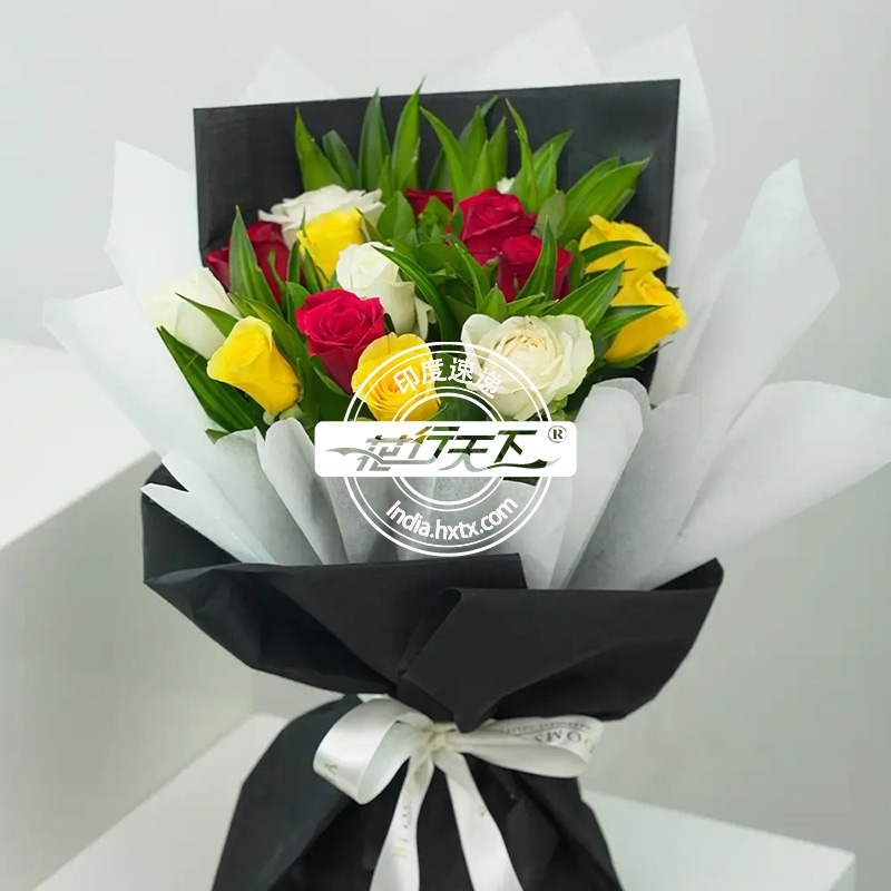 描述: 5枝红玫瑰、5枝白玫瑰和5枝黄玫瑰、精美包装。
