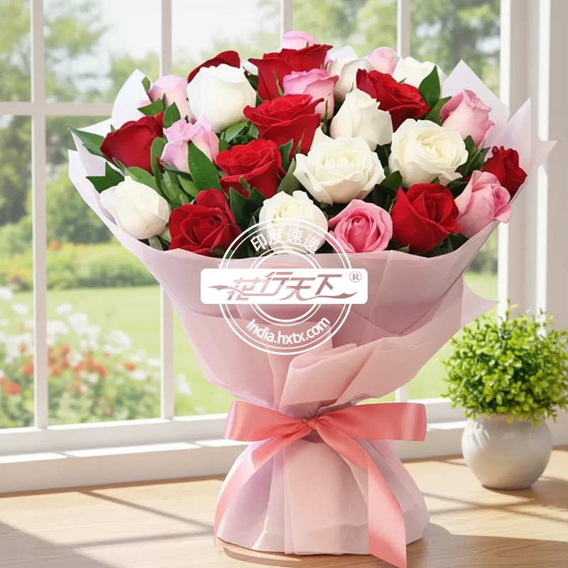 描述: 粉、白、红玫瑰25枝、精美包装。