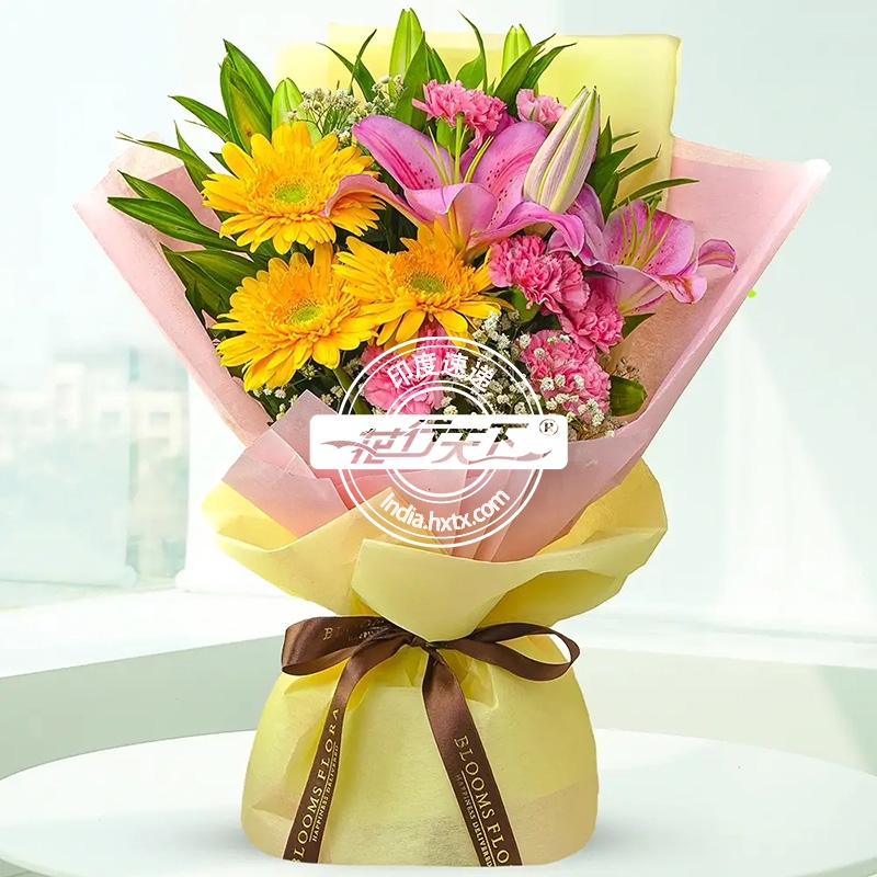 黄色非洲菊3枝、粉色康乃馨6枝、粉色百合2枝、精美包装.